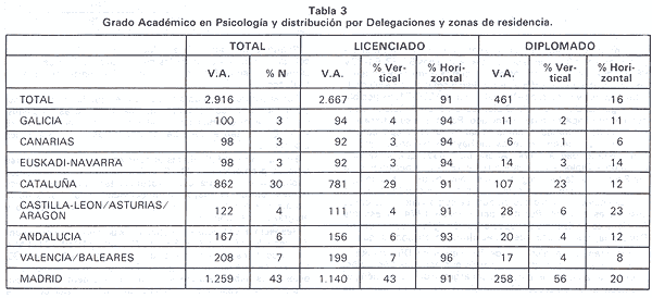 Analizando la distribución relativa de los Diplomados por Delegaciones, destaca el hecho de que suponen el 23% de la zona castellano - leonesa, y el 20% de la Delegación de Madrid, y sin embargo sólo suponen el 12% de la Delegación catalana, a pesar de las dos Escuelas de Psicología que existen o han existido en su zona, y el 8% de la zona valenciano - balear. Ver Tabla 4.