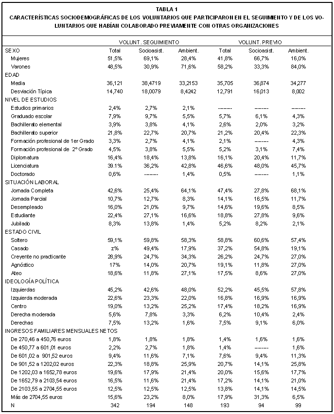 En la Tabla 1 se encuentran recogidos los porcentajes o los estadísticos descriptivos, según el caso, de las variables sociodemográficas objeto de análisis para los voluntarios que participaron en el seguimiento y para los voluntarios que habían colaborado previamente en otras organizaciones.