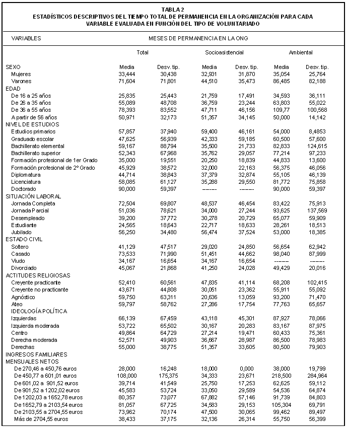 Tabla 2. Estadísticos descriptivos del tiempo total de permanencia en la organización para cada variable evaluada en función del tipo de voluntariado.