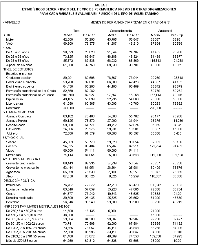 Tabla 3. Estadísticos descriptivos del tiempo de permanencia previo en otras organizaciones para cada variable evaluada en función del tipo de voluntariado.