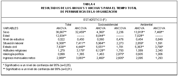 Tabla 4. Resultados de los ANOVA´s y ANCOVA´s para el tiempo total de permanencia en la organización.