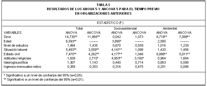 Tabla 5. Resultados de los ANOVA´s y ANCOVA´s para el tiempo previo en organizaciones anteriores.