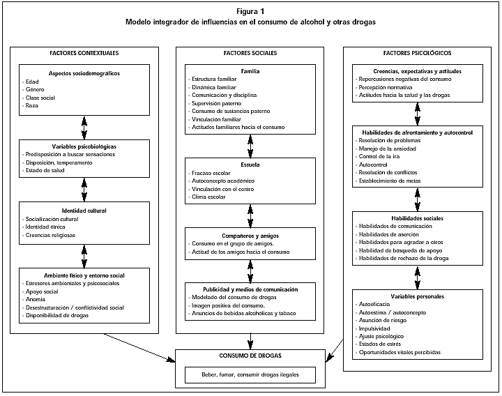 Dado el gran número de variables que influyen en el consumo de alcohol y otras drogas, parece apropiado plantear una etiología multicausal. En la figura 1 se presenta un modelo que integra los principales factores que contribuyen al consumo de drogas en la adolescencia, agrupados en tres categorías: a) los factores contextuales incluyen variables sociodemográficas, biológicas, culturales y ambientales; b) los factores sociales se refieren tanto al entorno próximo del adolescente, familia, escuela, grupo de amigos, como a la influencia mediática de la publicidad y los medios de comunicación; c) los factores personales comprenden cogniciones, habilidades, y otras variables personales relevantes.