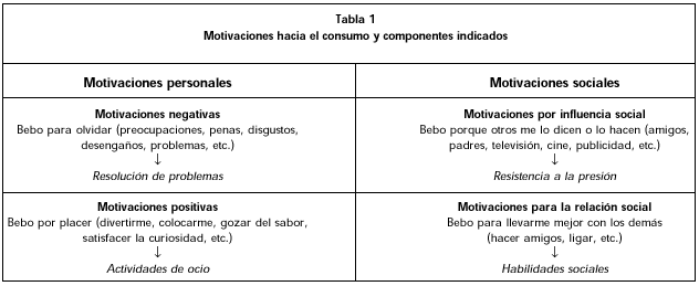En la línea de las intervenciones centradas en la mejora de la competencia personal, el programa Saluda resalta el entrenamiento de las habilidades directamente relacionadas con los factores de riesgo. La lógica del programa considera que los adolescentes consumen alcohol y otras drogas por motivos personales, búsqueda de estimulación positiva (p. ej., sensaciones placenteras) o escape/evitación de estimulación aversiva (p. ej., estados emocionales negativos), y por motivos sociales, instigación/imitación (p. ej., invitaciones de los amigos) o facilitación de las relaciones interpersonales (p. ej., desinhibición social). Los componentes básicos del programa Saluda se justifican por las cuatro motivaciones mencionadas (tabla 1):