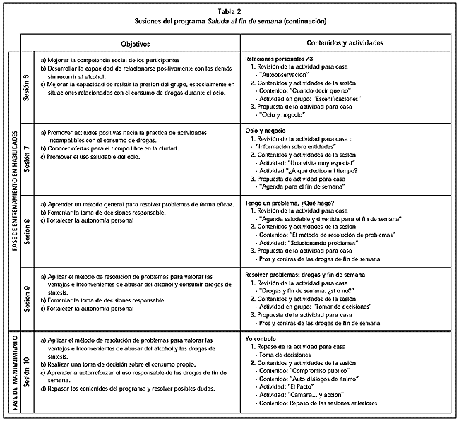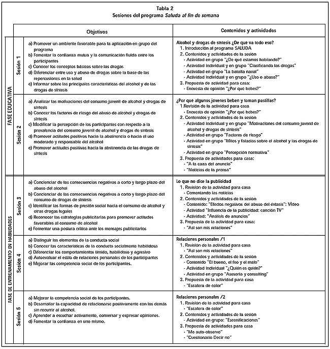 El programa Saluda consta de diez sesiones a razón de dos por semana. En la tabla 2 se describen sus objetivos, contenidos y actividades. Un estudio piloto reveló que el programa aumentaba el nivel de conocimientos sobre el alcohol y las drogas de síntesis, y modificaba la percepción normativa del consumo. Su eficacia preventiva fue media-alta (d+= 0,78), al compararlo con un grupo control sin intervención (Espada, 2002).