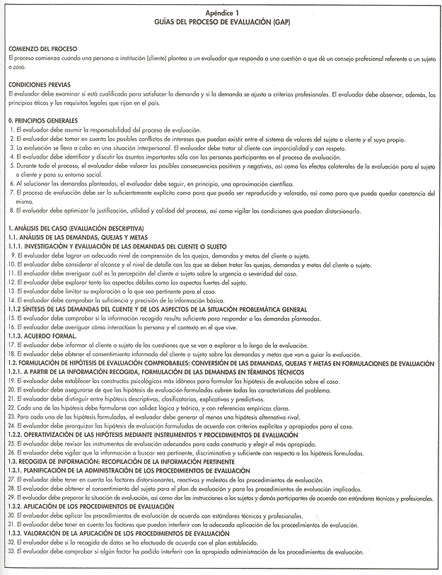 En la actualidad los estándares y las guías propuestas en el campo de la evaluación psicológica se limitan a los tests psicológicos y a su aplicación práctica1. Sin embargo, los tests son sólo uno de los tipos de procedimientos de evaluación psicológica, y su aplicación sólo una de las muchas estrategias o clases de acciones disponibles durante el desarrollo del proceso de evaluación. Los tests y el testing están estrechamente relacionados con un tipo de aproximación a la evaluación psicológica, a saber, la aproximación psicométrica. Esta es una de las razones por las que es relativamente fácil formular y establecer estándares o guías para los tests psicológicos y para su aplicación. El proceso de evaluación, bastante más amplio, es una parte indispensable de cualquier aproximación a la evaluación psicológica, incluso de aquéllas que no utilizan tests psicométricos. Esto hace que la creación de guías para el proceso de evaluación sea una empresa ambiciosa y complicada. Pero, lo que se puede lograr, al menos al nivel de recomendaciones que ayuden al evaluador a afrontar la complejidad y las exigencias del proceso de evaluación en varios contextos aplicados. Por ello, la Asociación Europea de Evaluación Psicológica (EAPA2) decidió patrocinar el desarrollo de unas Guías del Proceso de Evaluación (GAP3), creando una Comisión con este único propósito. Las GAP que se muestran en este artículo representan una primera propuesta para iniciar un amplio debate sobre cómo mejorar la práctica de la evaluación psicológica, así como la formación y el entrenamiento de los evaluadores.