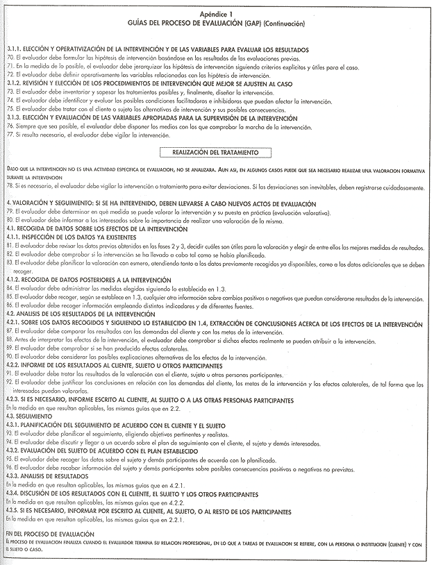 En resumen, nuestro objetivo general es el desarrollo de sugerencias procedimentales sobre el proceso de evaluación, esto es, el desarrollo de unas Guías para el Proceso de Evaluación (GAP), con la idea de ayudar a los evaluadores y a sus clientes a cumplir ciertas exigencias (cf., Joint Committee, 1994, p. 206), teniendo presente que estas guías deberían ser presentadas, difundidas y discutidas por un público experto amplio antes de ser aprobadas y adoptadas por los cuerpos profesionales y científicos. Cuando esto ocurra, las GAP serán útiles en los siguientes aspectos: