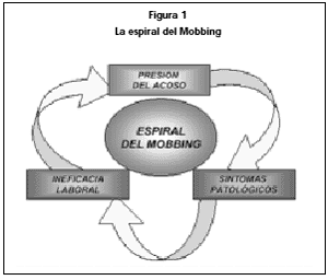 Si la persona o el grupo afectado se repliega en sí misma y se dispone a aguantar todo lo que sea necesario, se puede identificar en esta fase que la víctima se ha dejado atrapar por una segunda tela de araña y que con ello ha entrado directamente en lo que denominamos la espiral del Mobbing (Fig. 1). Esta espiral se caracteriza por un bucle de retroalimentación negativa en el que, la presión del acoso incidiendo en los síntomas patológicos, y éstos en la ineficacia de la respuesta laboral, justifican y refuerzan el hostigamiento de manera progresiva, llegando a agravar el problema hasta hacerlo insostenible.