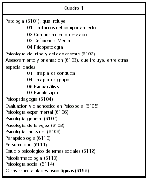 En efecto, la UNESCO y la OIT contemplan a la Psicología Clínica en el marco de una formación científica básica y una actuación profesional diversificada. La Nomenclatura Internacional de la UNESCO para campos de ciencia y tecnología (Comisión Interministerial de Ciencia y Tecnología,1990) contempla la Psicología en el campo científico 61, subdividido en las especialidades que se recogen en el Cuadro 1.