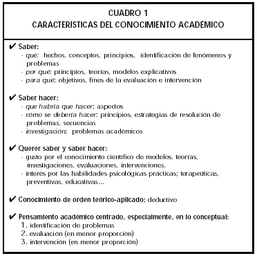 Es destacable que su mayor potencia reside en la construcción del conocimiento psicológico, como base conceptual de cualquier acercamiento posterior de la realidad. El conocimiento académico también incluye el saber hacer, aunque a un nivel potencial, dado que constituye el conocimiento de lo que se debería de hacer en una situación dada (como hay que evaluar e intervenir ante un determinado caso, como se deben cumplimentar los protocolos, etc..). En el mejor de los casos las actividades de las asignaturas permiten la construcción de un conocimiento aplicado, definido como hacer un Aensayo@ de una saber hacer o un Asupuesto@ del saber hacer, para que los alumnos apliquen el razonamiento deductivo y principios generales a la resolución de un problema dado. También cabe la posibilidad de que los alumnos se acerquen a la realidad, a través de los Prácticums de la Titulación oficial y realicen algunas tareas profesionales, sin un diseño previo de cómo integrar el conocimiento ya construido (formato académico) y el que comienzan a construir (formato profesional). Es destacable, que las habilidades de "saber hacer" a nivel de Ainvestigación@ suelen quedar reducidas a colaboraciones puntuales en tareas específicas, especialmente orientadas a problemas eminentemente académicos, tales como colaboración en la aplicación de inventarios o entrevistas, tabulación de datos obtenidos, etc.