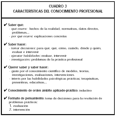 En síntesis,es un conocimiento de orden aplicado-practico, lo que lleva consigo una dimensión funcional en la resolución de los problemas reales, hasta la elaboración de principios aplicados. Por ello, el tipo de pensamiento que más pone en juego, es el proceso de toma de decisiones para la solución de problemas, especialmente en lo referido a los procesos de evaluación y de intervención. Estas características se recogen en el Cuadro 2.