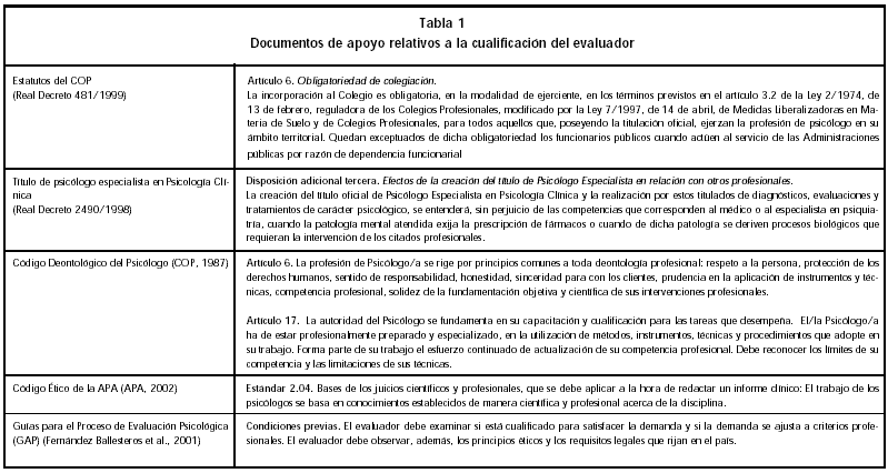 La primera clave a considerar es previa a la elaboración de cualquier posible informe y nos sitúa ante los condicionantes científicos, éticos y legales establecidos para ejercer profesionalmente este tipo de tareas. En primer lugar, la elaboración de informes psicológicos debe ser llevada a cabo por Licenciados en Psicología que hayan recibido la formación clínica adecuada y se encuentren colegiados en el Colegio Oficial de Psicólogos (salvo funcionarios públicos y otras excepciones que señala la Ley General de Colegios Profesionales). De forma complementaria, el reciente reconocimiento de la Psicología Clínica como especialidad sanitaria hace explícita la capacitación del Psicólogo Clínico Especialista para realizar diagnósticos y evaluaciones psicológicas, entre otras funciones. A estos aspectos básicos deben añadirse algunos otros de contenido ético y profesional como son los que inciden en la necesidad de mantener una formación continuada y una actualización profesional. Por otra parte, el Psicólogo debe ser consciente de su nivel de competencia profesional y de sus limitaciones a la hora de emprender la elaboración de cualquier tipo de informe clínico. Para completar esta serie de requerimientos, el evaluador debe, además, conocer y observar los principios éticos y los requisitos legales específicos vigentes en el ámbito territorial en el que actúe (por ejemplo: las distintas Comunidades Autónomas o los distintos estados de la Unión Europea) (Tabla 1).