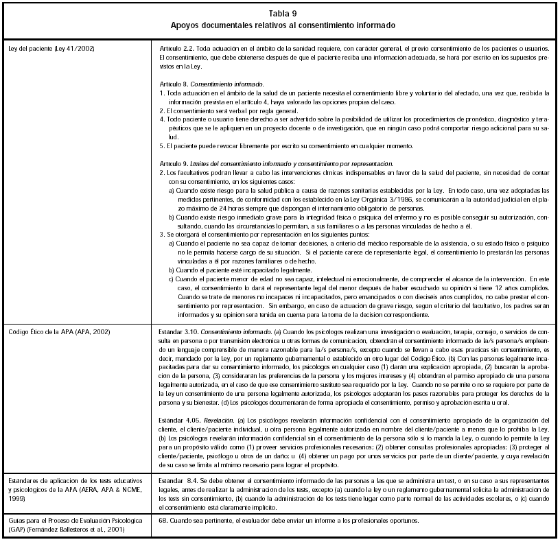 La nueva Ley del Paciente incluye de forma explícita el hecho de que toda actuación en el ámbito de la sanidad requiere, con carácter general, el previo consentimiento de los clientes y que este consentimiento por regla general será verbal. Algunos códigos éticos y asociaciones profesionales, como la Asociación Española de Neuropsiquiatría (AEN), añaden el calificativo de informado. Es decir, el consentimiento debe producirse después de una información veraz al cliente respecto a los procedimientos y riesgos que se asumen y se denominará consentimiento informado del cliente. Esta norma afecta también a la redacción de informes: el cliente debe consentir la elaboración del informe y aceptar, igualmente, la información incluida en él. Para que este consentimiento pueda denominarse informado, el cliente debe recibir la suficiente información relativa a la necesidad y posibles usos del informe y de la información y documentación incluida en el mismo. Esta norma tiene excepciones cuando el cliente se encuentra incapacitado, es menor o ha nombrado unos representantes legales que ejercen sus funciones. Por último, en aquellos casos en los que el Psicólogo estime que existe un riesgo real para la salud pública o para la integridad física o psíquica del cliente, y no se pueda conseguir su autorización por causas suficientemente justificadas o porque el cliente no la facilite, se podrán llevar a cabo las intervenciones clínicas (incluyendo la revelación de información) en favor de la salud del paciente, sin necesidad de contar con su consentimiento. No obstante, siempre que las circunstancias lo permitan, se consultará a sus familiares o a las personas vinculadas de hecho con él (Tabla 9).
