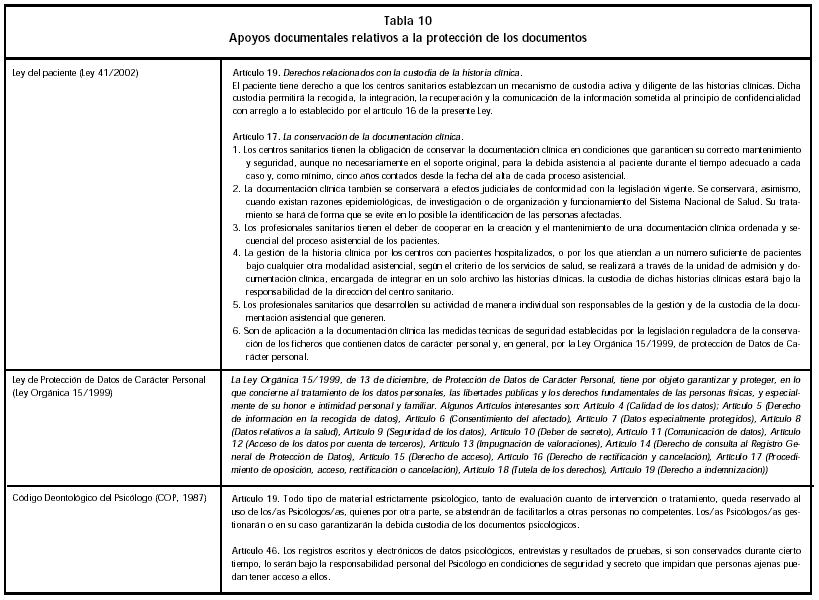 En los últimos años, el marco legal que afecta a la protección de datos y documentos clínicos ha cambiado sustancialmente. Se han hecho explícitas las obligaciones de los profesionales y centros sanitarios al respecto y se han aumentado las garantías de confidencialidad y custodia de datos de forma muy importante. Además, se comienzan a considerar los requisitos relacionados con las nuevas tecnologías y, de forma especial, la informática e Internet. En la actualidad, el Psicólogo es el responsable de la seguridad de los registros escritos y electrónicos de datos psicológicos, entrevistas y resultados de pruebas administradas por él. Los centros sanitarios y, por extensión, los Psicólogos, están obligados a conservar la documentación clínica, como mínimo, cinco años contados desde la fecha del alta. Esta documentación se guardará en condiciones óptimas para su mantenimiento y seguridad, que serán responsabilidad del profesional (Tabla 10).