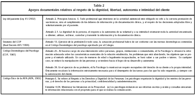 Tabla 2. Apoyos documentales relativos al respeto de la dignidad, libertad, autonomía e intimidad del cliente.