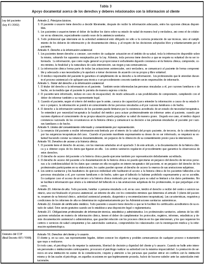 Son muchos los manuales y textos de intervención psicológica clínica que aconsejan incluir la información al cliente entre las tareas propias de la evaluación y el tratamiento psicológico, pero son menos los que indican la existencia del precepto legal que establece la obligatoriedad de ofrecer toda la información al cliente para que sea éste quién decida finalmente entre las opciones de tratamiento que se le puedan ofrecer en cada ocasión. El cliente tiene derecho a elegir el tratamiento. De esta forma, el Psicólogo tiene la obligación de informar verazmente al cliente, siempre y en cualquier circunstancia, de modo adecuado a sus posibilidades de comprensión, incluso en caso de incapacidad, déficit cognitivos, ausencia de conciencia de enfermedad, etc. En estos casos, se informará también a su representante legal.