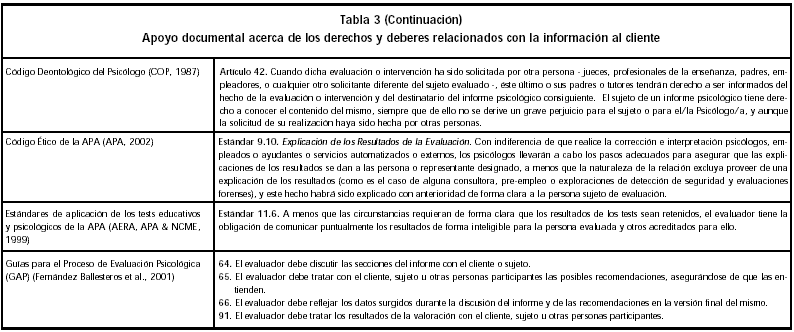 El ejercicio de este grupo de derechos y obligaciones de informar se complementa con la recomendación académica de devolver la información al cliente de forma verbal (Turkat, 1985; Muñoz, 2003). El Psicólogo discutirá con el cliente la información obtenida a través del proceso de evaluación psicológica en una entrevista que puede denominarse de devolución de información. A través de esta comunicación oral del informe, el Psicólogo acumulará pruebas para el contraste de hipótesis; ofrecerá al cliente una explicación acerca de sus problemas y los tratamientos posibles, así como un esquema explicativo que permita al cliente formular su problema y/o modificar el esquema del mismo, con el fin de partir de una misma formulación que facilite el cambio. Esto facilitará una oportunidad de diálogo con el cliente acerca de las posibles opciones de tratamiento a seguir, con objeto de ajustarlo en lo posible a sus preferencias y ayudar a aumentar la efectividad y adherencia al tratamiento.