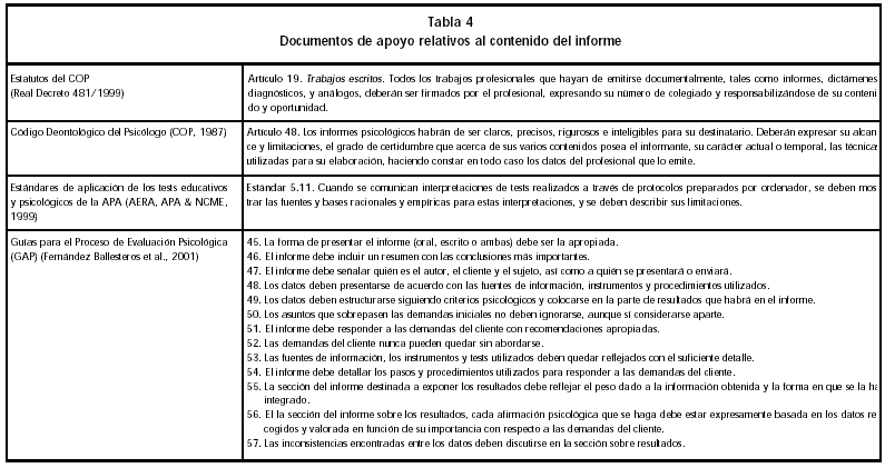 Recientemente, las GAP aportan una serie de puntos básicos a incluir en los informes psicológicos que, fundamentalmente, se pueden resumir en: el nombre del autor, del cliente y del sujeto a quién se presentará o enviará, las fuentes de información, instrumentos, procedimientos y tests utilizados, los pasos y procedimientos utilizados para responder a las demandas del cliente, un resumen con las conclusiones más importantes y una serie de recomendaciones apropiadas. Asimismo, las GAP destacan la importancia de estructurar los datos siguiendo criterios psicológicos y colocarlos en la parte de resultados que necesariamente debe incluirse en el informe, donde, además, debe reflejarse el peso dado a la información obtenida, los datos en que se basan las afirmaciones realizadas, las inconsistencias encontradas y la valoración con respecto a las demandas del cliente (Tabla 4).