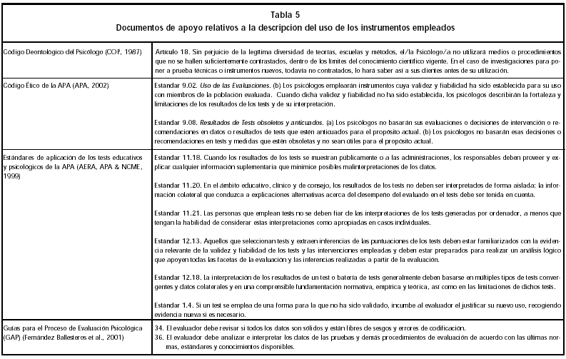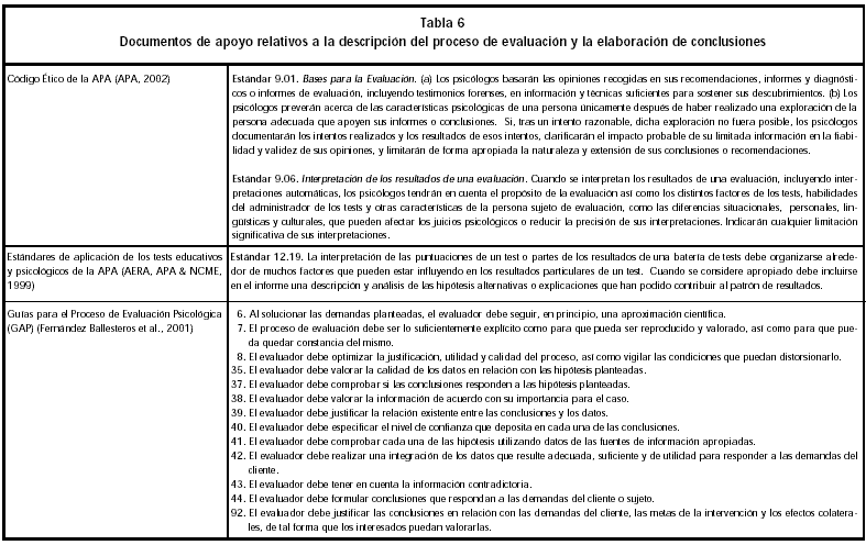 Aunque existen algunas consideraciones generales a tener en cuenta para el correcto uso de los tests en el proceso de evaluación - que aquí recogemos como punto de partida, como son la obligatoriedad de utilizar siempre medios o procedimientos suficientemente contrastados, instrumentos cuya validez y fiabilidad haya sido debidamente establecida y medidas y tests actualizados - las normas y guías para la inclusión de estos aspectos en el informe psicológico no son demasiado numerosas. Algunas de ellas, provienen de los estándares establecidos por la APA para la interpretación y comunicación de los resultados de los tests, como son las recomendaciones de no interpretar los tests de forma aislada, sino basándose en múltiples tipos de tests convergentes y datos colaterales y en una comprensible fundamentación normativa, empírica y teórica, teniendo en cuenta las limitaciones de dichos tests y explicando de manera adecuada cualquier información suplementaria que minimice las posibles interpretaciones erróneas de los datos (Tabla 5).