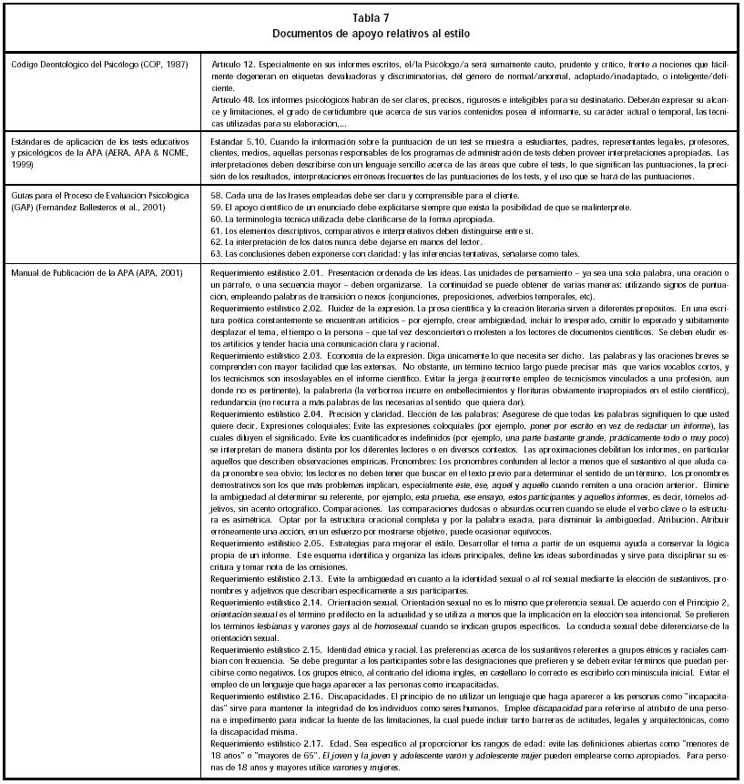 Al redactar el informe, o informar verbalmente de los resultados de una evaluación, el Psicólogo debe considerar unos ciertos requerimientos de estilo que ayuden a entender mejor la información que se quiere transmitir. Este tipo de requerimientos han sido abordados con cierto detalle por el Código Deontológico del Psicólogo, los Estándares de aplicación de los tests de la APA, las GAP y, muy especialmente, por el Manual de Publicación de la APA que, aunque originariamente se refiere a la publicación de textos científicos, se ajusta perfectamente a nuestras necesidades. Considerando que en última instancia todo informe clínico es un documento científico, la redacción tendrá en cuenta las peculiaridades de este tipo de documentos y deberá: utilizar un lenguaje comprensible para el receptor, ser claro y racional, huyendo de artificios, emplear palabras y oraciones breves, evitar el empleo de jerga, palabrería y redundancia, utilizar un estilo preciso y claro, ayudarse de esquemas que identifiquen y organicen las ideas principales, evitar malas interpretaciones, etiquetas y ambigüedades en cuanto a la identidad sexual y étnica y todo tipo de términos negativos o estigmatizantes para referirse al cliente (Tabla 7).