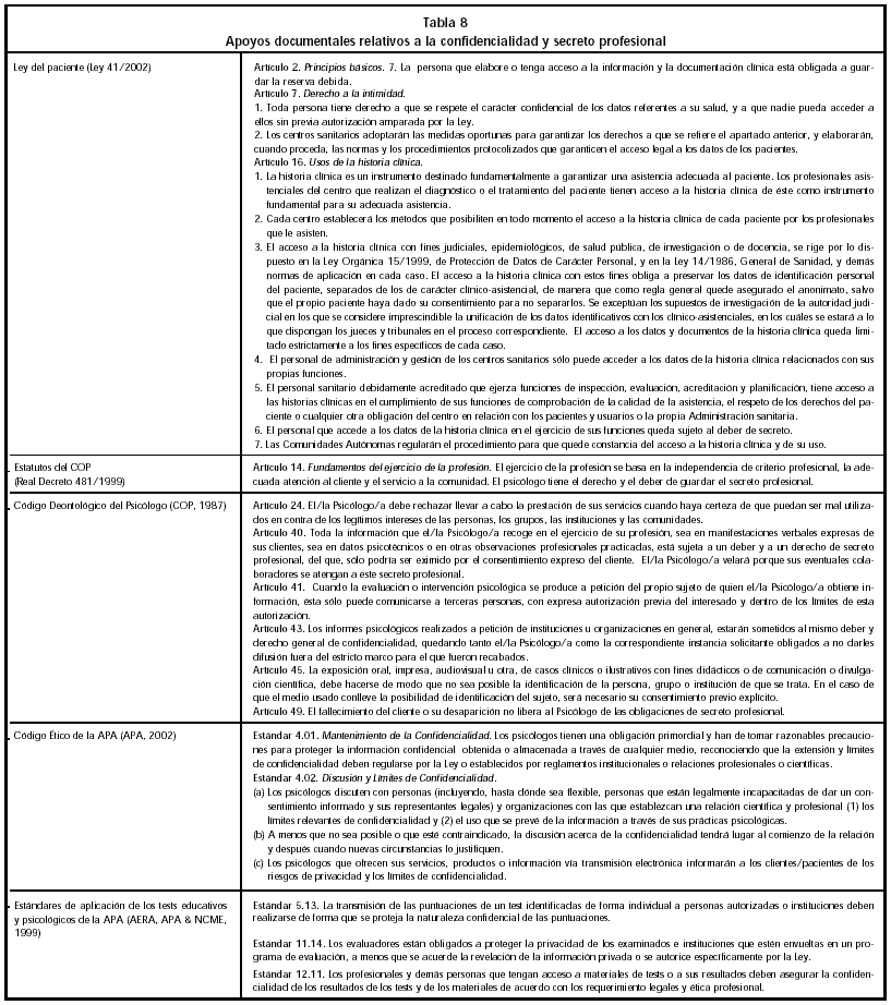 Desde 1987 se encuentra vigente el Código Deontológico del Psicólogo (COP, 1987), que ya incluía referencias directas a este ámbito y que, a nuestro parecer, ha centrado la actividad hasta el momento en nuestro país. Los cambios más recientes afectan de forma muy importante a los aspectos profesionales y técnicos, éticos y legales. En primer lugar, se han revisado y especificado aquellos aspectos relacionados con la calidad de la evaluación: la revisión de los estándares de aplicación de los tests educativos y psicológicos de la American Psychological Association (APA) (AERA, APA & NCME, 1999) y la publicación de las GAP (Fernández Ballesteros et al., 2001; 2003) significan un aumento en los requerimientos técnicos de la evaluación psicológica. En segundo lugar, la revisión del Código Ético de la APA (APA, 2002), que es una referencia obligada en el desarrollo profesional de nuestra disciplina en el mundo, nos sitúa ante una posición ética muy exigente. En tercer lugar, la quinta revisión del Manual de Publicación de la APA (APA, 2001) aporta algunas referencias importantes para mantener un lenguaje adecuado, científico y garante de los derechos de las personas. Finalmente, la aparición de nuevos marcos legales en nuestro país delimitan éste campo, el Real Decreto de creación de la titulación de Psicólogo Especialista en Psicología Clínica (Real Decreto 2490/1998), el Real Decreto de Estatutos del Colegio Oficial de Psicólogos (Real Decreto 481/1999), la Ley de Protección de Datos de Carácter Personal (Ley Orgánica 15/1999) y la reciente Ley básica reguladora de la autonomía del paciente y de derechos y obligaciones en materia de información y documentación clínica (Ley 41/2002) señalan hitos históricos en el uso de la información y en el quehacer clínico del Psicólogo.