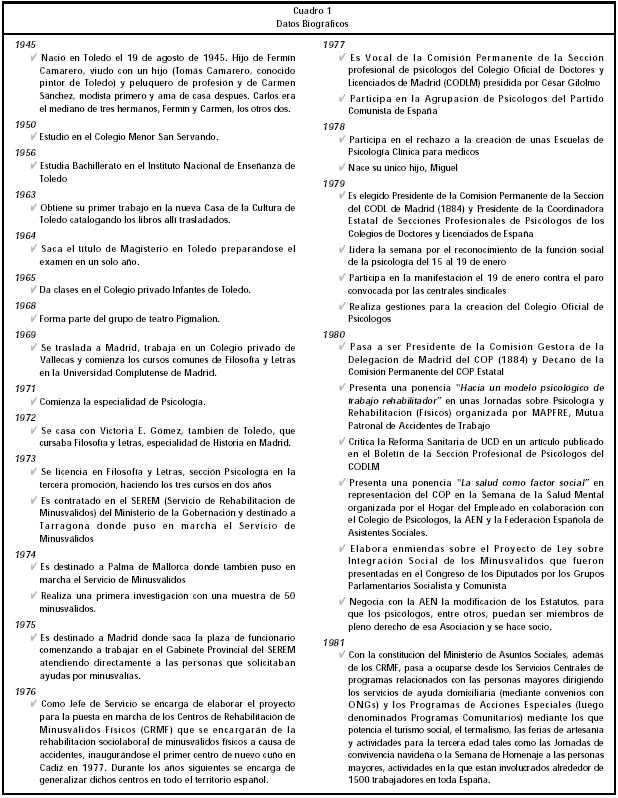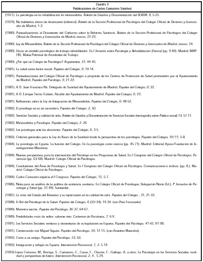 1 Este trabajo ha sido elaborado a partir de la revisión de todos los artículos y capítulos de libros publicados por Carlos Camarero, y relacionados con él, consultados a través de diferentes fuentes (Psicodoc 2002, Biblioteca del Ministerio de Trabajo y Boletines del Colegio de Doctores y Licenciados en Filosofía y Letras de Madrid). También se han realizado entrevistas personales con su mujer, Victoria E. Gómez y con amigos y compañeros de trabajo, Julián Zamora y Aurelio Martínez, entre otros.