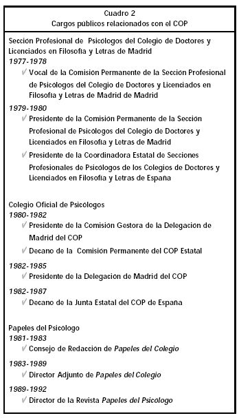 Su compromiso político y personal, su rápida inserción profesional como psicólogo en el SEREM10 e incluso su aspecto de seriedad personal le llevaron a ocupar diferentes cargos de responsabilidad en la incipiente organización profesional de los psicólogos. (Cuadro 2)