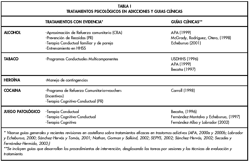 TABLA I. TRATAMIENTOS PSICOLÓGICOS EN ADICCIONES Y GUIAS CLÍNICAS