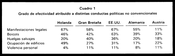 La aprobación de las manifestaciones legales oscila desde el 58% de la muestra austríaca hasta el 80% de la muestra holandesa; los boicots cuentan con un apoyo que va desde el 22% de la muestra austríaca hasta el 52% de la americana, y la ocupación de edificios es aceptada por el 42% de la muestra holandesa.