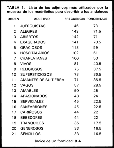 - Andaluces.- 16 adjetivos aparecen en el contenido del estereotipo de los andaluces tanto en 1979 como en la presente investigación: juerguistas, alegres, abiertos, exagerados, graciosos, hospitalarios, charlatanes, vivos, religiosos, supersticiosos, amantes de su tierra, vagos, amables, fanfarrones, cariñosos y generosos.