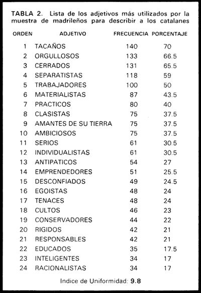 - Catalanes.- los adjetivos que aparecen en las dos investigaciones son: tacaños, orgullosos, cerrados, separatistas, trabajadores, materialistas, prácticos, clasistas, amantes de su tierra, ambiciosos, individualistas, antipáticos, emprendedores, egoístas, tenaces, cultos, responsables, inteligentes y racionalistas.