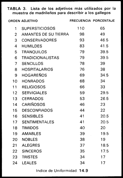 Es de destacar como el adjetivo conservador", que no aparecía en el contenido del estereotipo en 1979, ha pasado a ocupar el tercer lugar. Es casi inevitable pensar en la posible influencia que haya podido tener los resultados electorales en este pronunciado cambio. Al mismo tiempo, dentro del estereotipo de los gallegos se han producido otros importantes cambios de orden que reducen significativamente el índice de la correlación de Spearman, así, por ejemplo, "cariñosos" desciende del primer lugar al catorceavo, mientras que "hospitalarios" y "tradicionalistas" ascienden de los puestos décimosexto y decimoséptimo al octavo y el sexto respectivamente. Parece que le estereotipo de los gallegos es aún bastante diluido y vago, y ello provoca fuertes alteraciones.