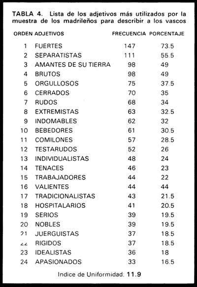 - Vascos: tanto en 1979 como en los resultados actuales se consideraba a los vascos: fuertes, separatistas, amantes de su tierra, brutos, orgullosos, cerrados, extremistas, indomables, comilones, individualistas, tenaces, trabajadores, valientes y nobles.
