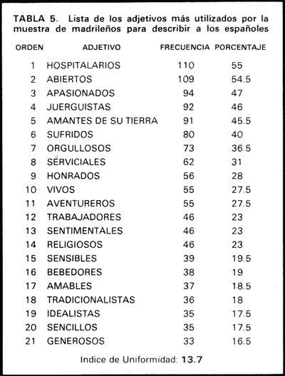 Asimismo, en la tabla 5 se presentan el contenido del estereotipo que los madrileños tienen de los españoles. En cada tabla aparecen los adjetivos con porcentajes de asignación superiores a los del azar, con sus correspondientes frecuencias y porcentajes; asimismo, se incluye el índice de uniformidad de cada estereotipo.
