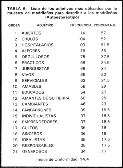 En la tabla 6 se presentan los adjetivos que constituyen el contenido del autoestereotipo de los madrileños. Como en los casos anteriores, el porcentaje mínimo significativo de atribuciones es del 16.33%.