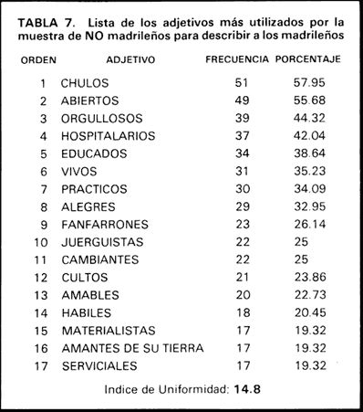 Como ya dijimos anteriormente y como complemento a nuestra investigación consideramos interesante comparar estos datos con los de una muestra de estudiantes residentes en Madrid, pero no nacidos en esta Comunidad Autónoma. El estereotipo que esta muestra tiene de los madrileños se presenta en la tabla 7.