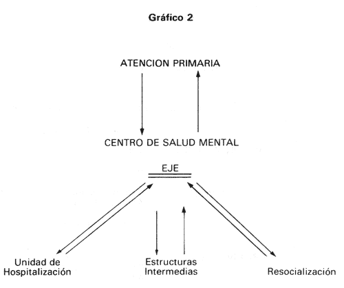 Los servicios periféricos se fueron creando y ordenando de forma descentralizada y de acuerdo a las áreas de salud, contempladas en el Mapa Sanitario. De esta manera, se pudo contar en cada territorio con Servicios de Salud Mental propios, que tenían un ámbito de acción diferenciado; empezando por crear aquellos que, en función de las orientaciones epidemiológicas, aparecieron como más necesarios: es decir, los Equipos territoriales de los Centros de Salud Mental. (Ver más abajo el cuadro de la distribución actual de Servicios de Salud Mental.) En el gráfico se representa el flujo y la dirección que puede seguir la demanda, apareciendo como eje de los servicios especializados el Centro de Salud Mental. (Ver Gráfico 2).