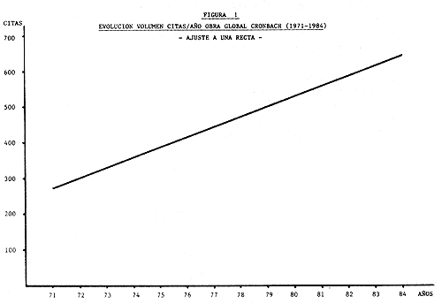 Figura 1. Evolución - Volúmen - Citas / año obra global Cronbach (1971-1984).