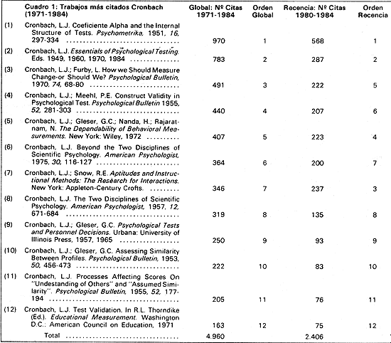 Como era de esperar, el impacto de las distintas obras es muy desigual. Efectivamente, 12 trabajos concentran 4.960 citas, esto es, un 76,7% del total (media por trabajo de 413,3). El Cuadro 1 recoge estas 12 obras, ordenadas por el volumen de citas que recibe cada una de ellas en el período 1971-1984. El lector puede apreciar allí los títulos de mayor impacto, que a la vez resumen bien la aportación de Cronbach hasta finales de los años 70.