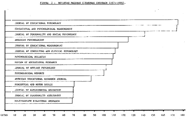 Otra manera de descubrir dónde se ha producido la repercusión de la obra de un autor, es detectar en cuántas, y más concretamente, en qué publicaciones científicas periódicas se acumulan las citas. En el período 1971-1984, la obra de Cronbach es citada en cerca de 900 publicaciones periódicas diferentes (en su casi totalidad, revistas). Se demuestra aquí, todavía de otra manera, cuán extendida es la repercusión del autor.