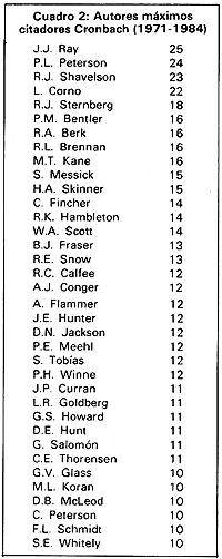 Otra información de interés la constituye conocer el volumen y el nombre de los autores que citan a Cronbach. Nuestro autor es citado, en el período estudiado, por más de 3.300 investigadores con un rango que va entre 1 y 25 citas. Esto demuestra que su repercusión está muy extendida dentro de los diferentes ámbitos de la psicología. Más que ser un "autor de escuela" es un autor de "referencia obligada" en ámbitos muy diferentes, tanto teóricos como aplicados. Esto se demuestra con claridad al conocer los nombres de los autores que más le citan, tal y como se observa en el Cuadro 2.