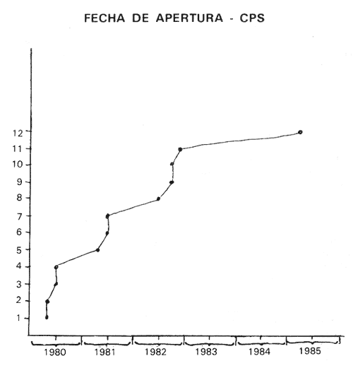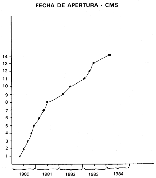 CMS: La gráfica refleja el desarrollo progresivo de la apertura de centros. Se aprecia el rápido crecimiento durante el primer año (abril 1980 a junio 1981), con un total de ocho centros abiertos en dicho período. Posteriormente este crecimiento es más moderado: dos centros en 1982; tres, en 1983 (dos de ellos con reestructuraciones) y uno en 1984. Desde febrero de 1984 no se han inaugurado más CMS.