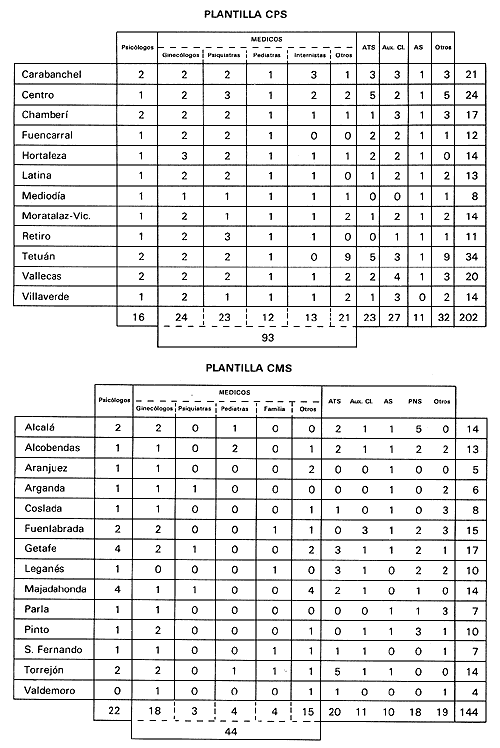 En la actualidad son trescientos cuarenta y siete los profesionales que trabajan en Centros de Salud de Madrid y sus municipios. La medía de profesionales que trabajan en un centro es de trece personas, aunque hoy una diferencia muy importante ya que oscilan entre los cuatro de Valdemoro y los treinta y cuatro de Tetuán. Esta diferencia sigue siendo muy acusada si estudiarnos CPS y CMS por separado. En los CPS trabajan como media diecisiete profesionales por centro, oscilando entre los ocho de Mediodía y los treinta y cuatro de Tetuán. En lo que se refiere a CMS son diez los profesionales que trabajan por centro, existiendo una variación entre los cuatro de Valdemoro y los dieciocho de Getafe.