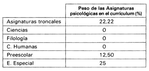 Las asignaturas de contenido psicológico tienen en el currículum actual de los estudios de Magisterio, el peso que puede observarse en el cuadro 1.