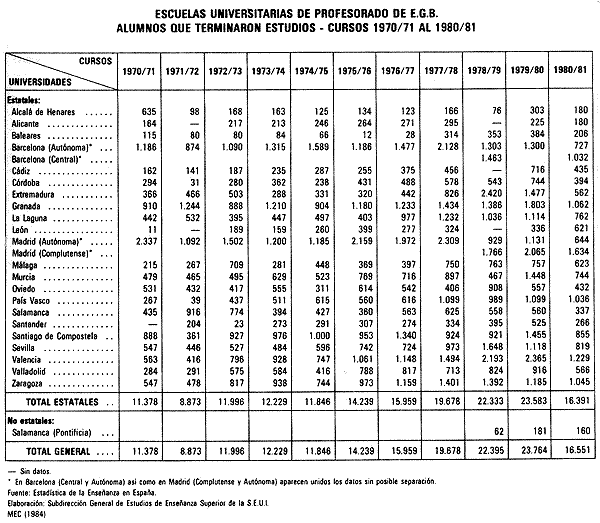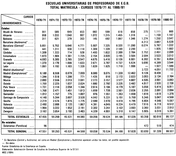 Tabla 1. Escuelas Universitarias de profesorado de E.G.B., cursos 1970/71 - 1980/81.