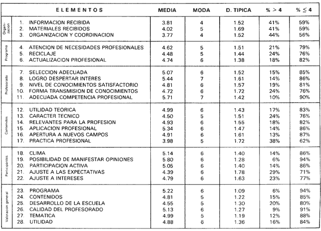 En primer lugar y con el fin de ordenar y recoger las numerosas dimensiones o aspectos a evaluar (ver para una revisión: ANGULO, FERNANDEZ Y MARTINEZ, 1987) y al objeto de poder responder a algunas de las principales cuestiones que se plantean desde distintos enfoques de evaluación (ver para una revisión actualizada: HOUSE, 1980) y que facilitan la toma de decisiones y un análisis de la eficiencia y de la consecución de los objetivos previstos, se establecieron bloques teóricos principales: siete, para la Escala de participantes (ORGANIZACION, PROGRAMACION, CONTENIDOS, PROFESORADO, PARTICIPANTES, VALORACION GENERAL, PROSPECCION) y tres bloques teóricos para la Escala de profesores (ORGANIZACION BUROCRATICA, PROGRAMACION ACADEMICA, GENERAL - Contenidos, Relación Profesor-Alumno, Satisfacción).