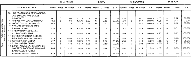 La pauta básica para la interpretación general de cada taller se determinó por: a) el corte teórico a partir del cual se juzgaba la valoración del mismo como positiva (Media igual o superior a 3,5 y Moda igual o superior a 4).