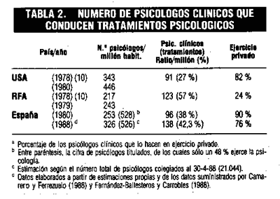 Constatamos en la tabla 2 que se ha producido una estabilización del ratio de psicólogos por millón de habitantes (526 por millón), el cual no ha crecido en España en los últimos ocho años, mientras que se ha producido un incremento significativo en el número de psicólogos que ejerce su profesión (de 253 a 326 por millón de habitantes), con un ligero aumento de la proporción de los que ejercen como psicólogos clínicos (del 38 al 42,3%), habiéndose reducido del 90 al 76% los que lo hacen pro cuenta propia. Efectivamente, en estos ocho años el proceso de reforma de las instituciones sanitarias y la asunción de competencias en materia de salud por las administraciones locales y autonómicas ha sido un factor decisivo para la reducción de la oferta privada, que pese a todo sigue siendo muy mayoritaria (en el caso de Madrid se eleva al 82% los psicólogos que ejercen a nivel privado en 1988) y similar a los datos USA. La futura dirección de la reforma en salud mental, bien potencie los conciertos con instituciones privadas o bien se creen mayor número de servicios públicos, incidirá decisivamente en esta tendencia. El caso alemán supone el ejemplo opuesto al de USA por el particular sistema de reembolso por la Seguridad Social alemana del costo de la psicoterapia ejercida por psicólogos bajo supervisión médica.