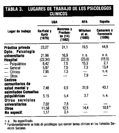 Los lugares de trabajo más característicos de los psicólogos clínicos españoles quedan reflejados comparativamente en la tabla 3. Son los siguientes: