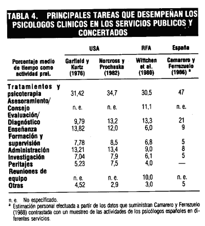 Un tópico de discusión de los últimos años ha sido la progresiva transformación de las actividades que desarrolla el psicólogo clínico en un desplazamiento creciente desde las tareas de evaluación y diagnóstico a las de tratamiento. Efectivamente esta tendencia ha sido clara en los psicólogos españoles, que de una dedicación que hace diez años era casi exclusiva a las tareas de diagnóstico se ha pasado a un abandono paulatino de las mismas. La tabla 4 recoge información comparativa sobre estos extremos. En ella observamos que si bien en la encuesta de Camarero y Ferrezuelo (1988) el 74,8% de los psicólogos españoles opinan que el psicólogo clínico desempeña - entre otras- funciones de tratamiento, mientras que el 67,2% incluyen las tareas diagnósticas y evaluativas, la proporción de tiempo estimada que los psicólogos españoles dedican actualmente al tratamiento es más de doble que el que dedican al diagnóstico (47) frente al 21%), al menos en lo que a los servicios clínicos públicos y concertados se refiere. Esto indicaría que se ha invertido la tendencia tradicional y que en la actualidad los psicólogos clínicos españoles hipertrofian sus actividades de tratamiento (también, aunque en menor medida, las de diagnóstico) en detrimento de otras actividades relevantes para su ejercicio, como la enseñanza, formación y supervisión, investigación, etc. Este énfasis en el tratamiento significativamente mayor que el que se aprecia en USA o Alemania, aunque es un resultado lógico del proceso de consolidación de la identidad profesional del psicólogo clínico en torno a su rol como «terapeuta», no es necesariamente deseable. De que el psicólogo clínico dedique mayores esfuerzos a la investigación, enseñanza de otros profesionales y no profesionales, administración y gestión de programas y servicios, promoción de la salud - mediante el trabajo coordinado- en y con los propios equipos de profesionales, etcétera, depende el mayor desarrollo y enriquecimiento futuro de su función profesional.